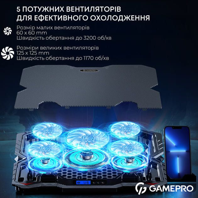 GamePro CP560 - надійна охолоджуюча підставка для ноутбуків до 16". Оснащена потужним вентилятором, що забезпечує ефективне охолодження під час роботи та ігор. Має регульований кут нахилу для зручності користування та ергономічний дизайн. Підключається через USB і гарантує стабільну роботу вашого ноутбука без перегріву.